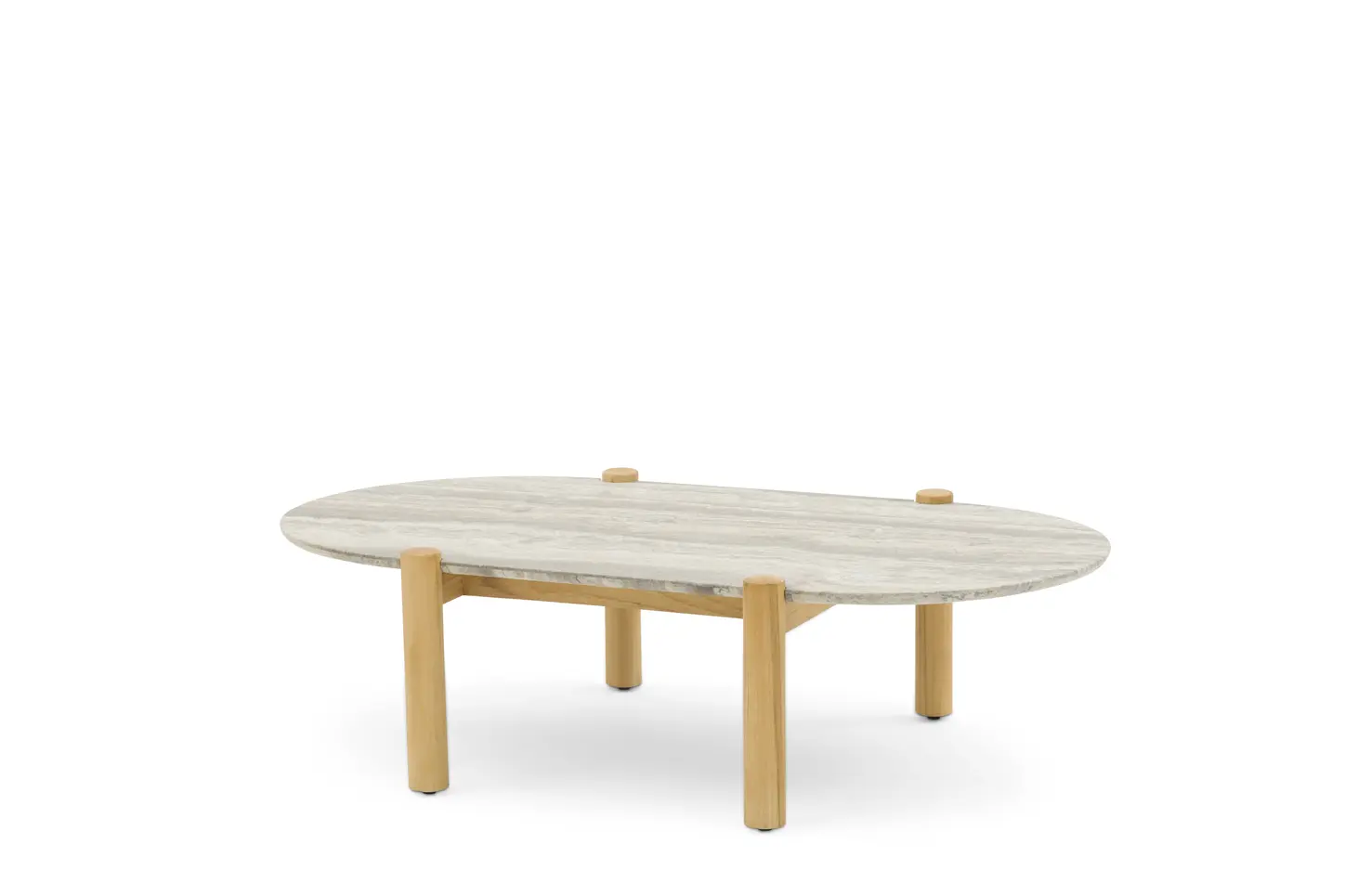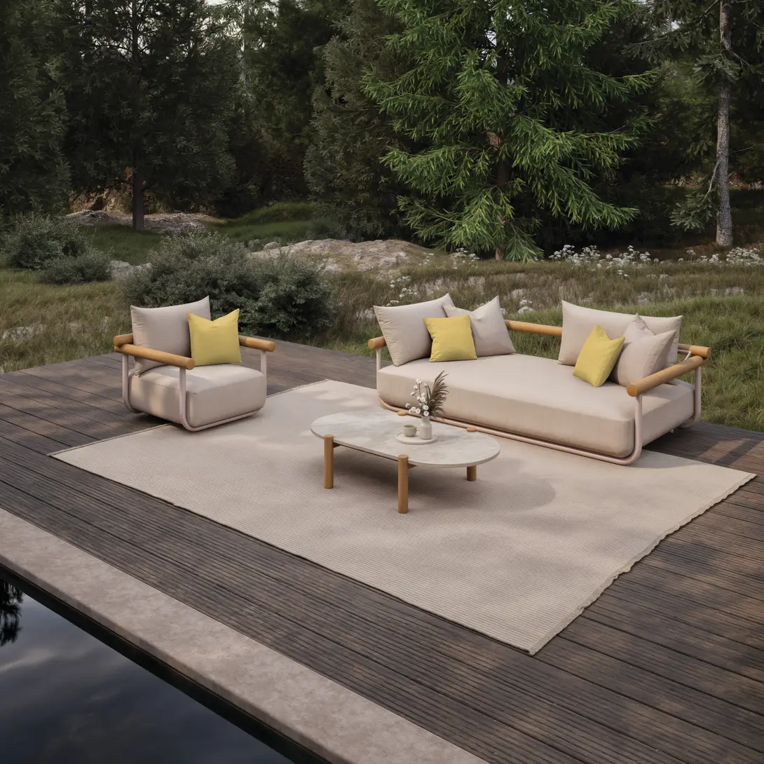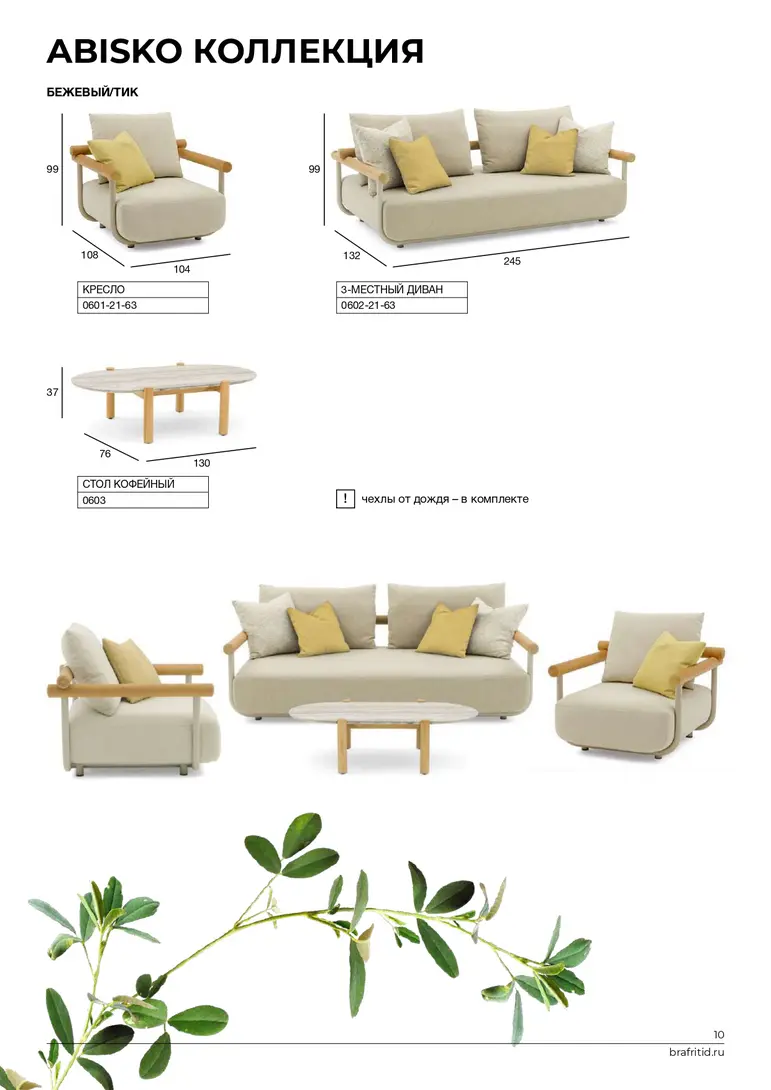 Ткань подушек- олефин с солнцезащитой и водоотталкивающей пропиткой. Столешница изготовлена из травертина (известняковая горная порода).
