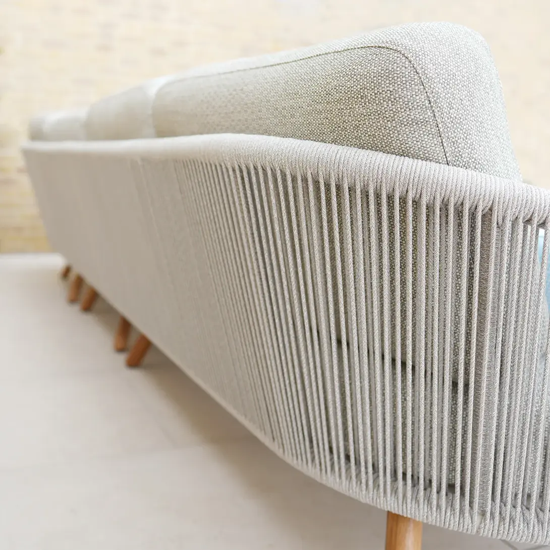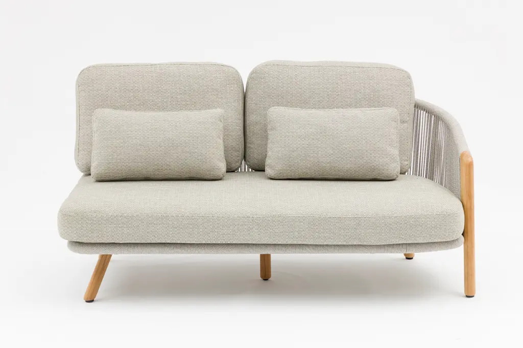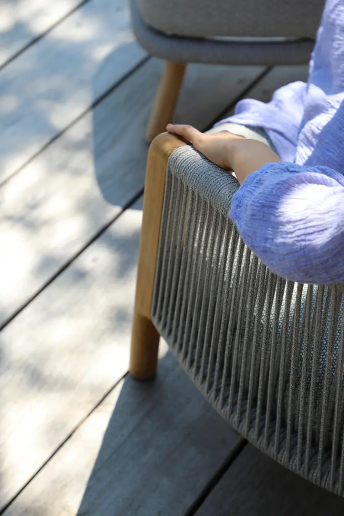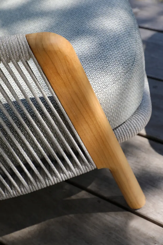 Алюминиевый каркас, ножки из тикового дерева FSC + олефиновая веревка, подушка с наполнителем из пенополиуретана, солнцезащитная ткань.