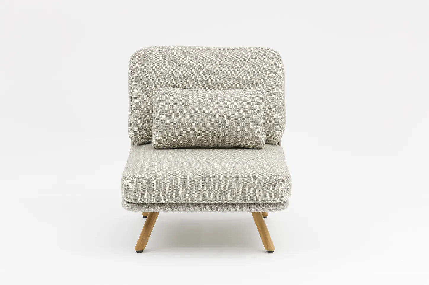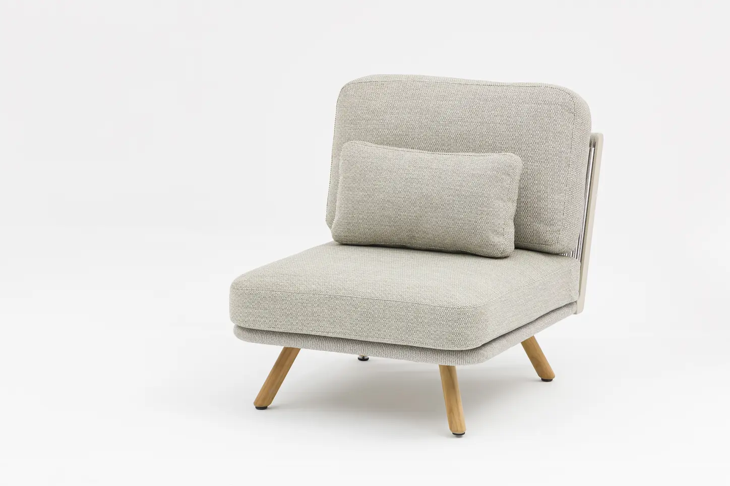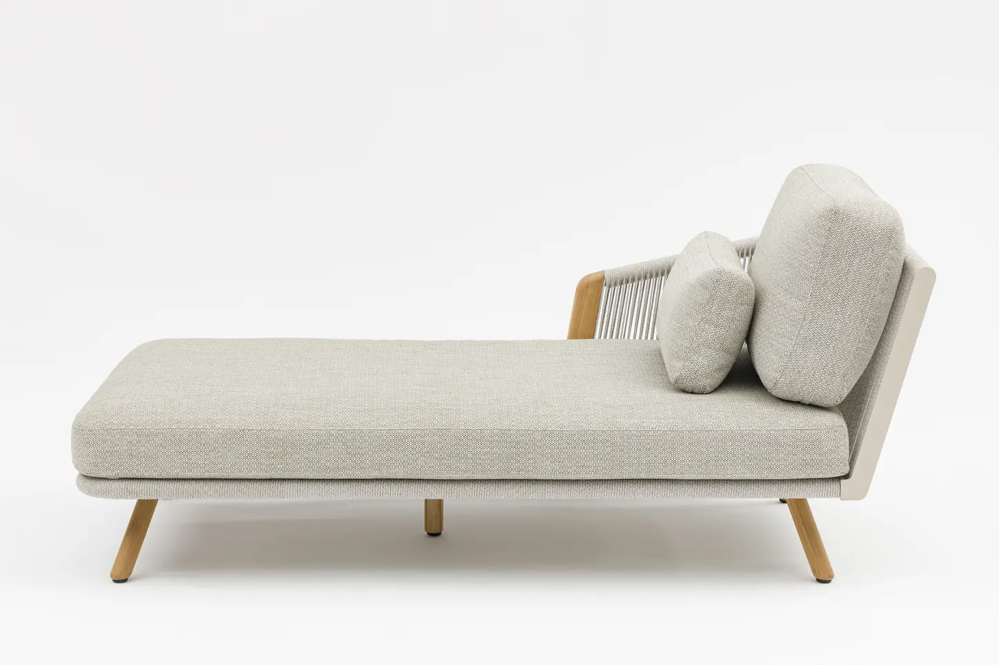 Алюминиевый каркас, ножки из тикового дерева FSC + олефиновая веревка, подушка с наполнителем из пенополиуретана, солнцезащитная ткань.