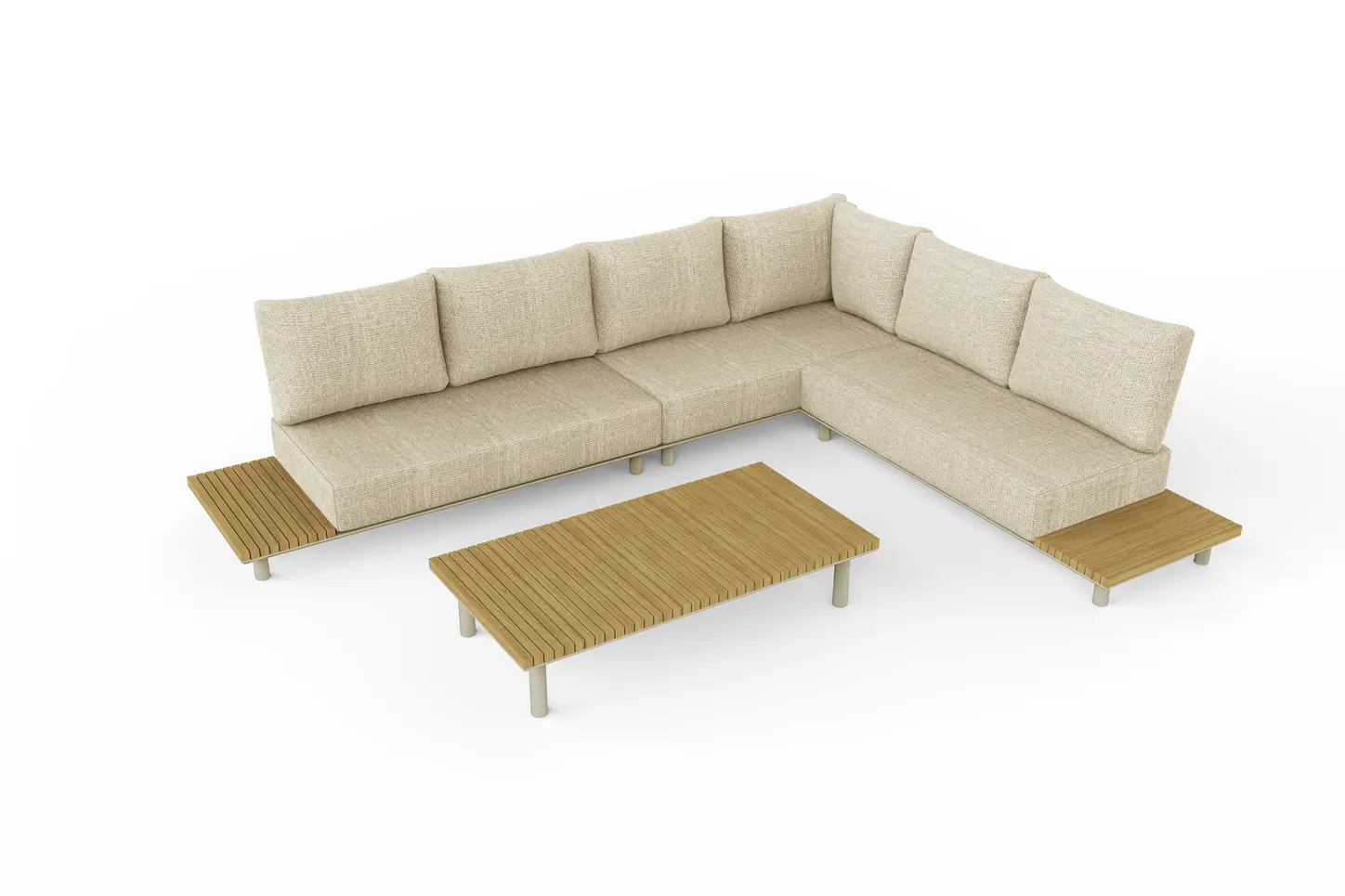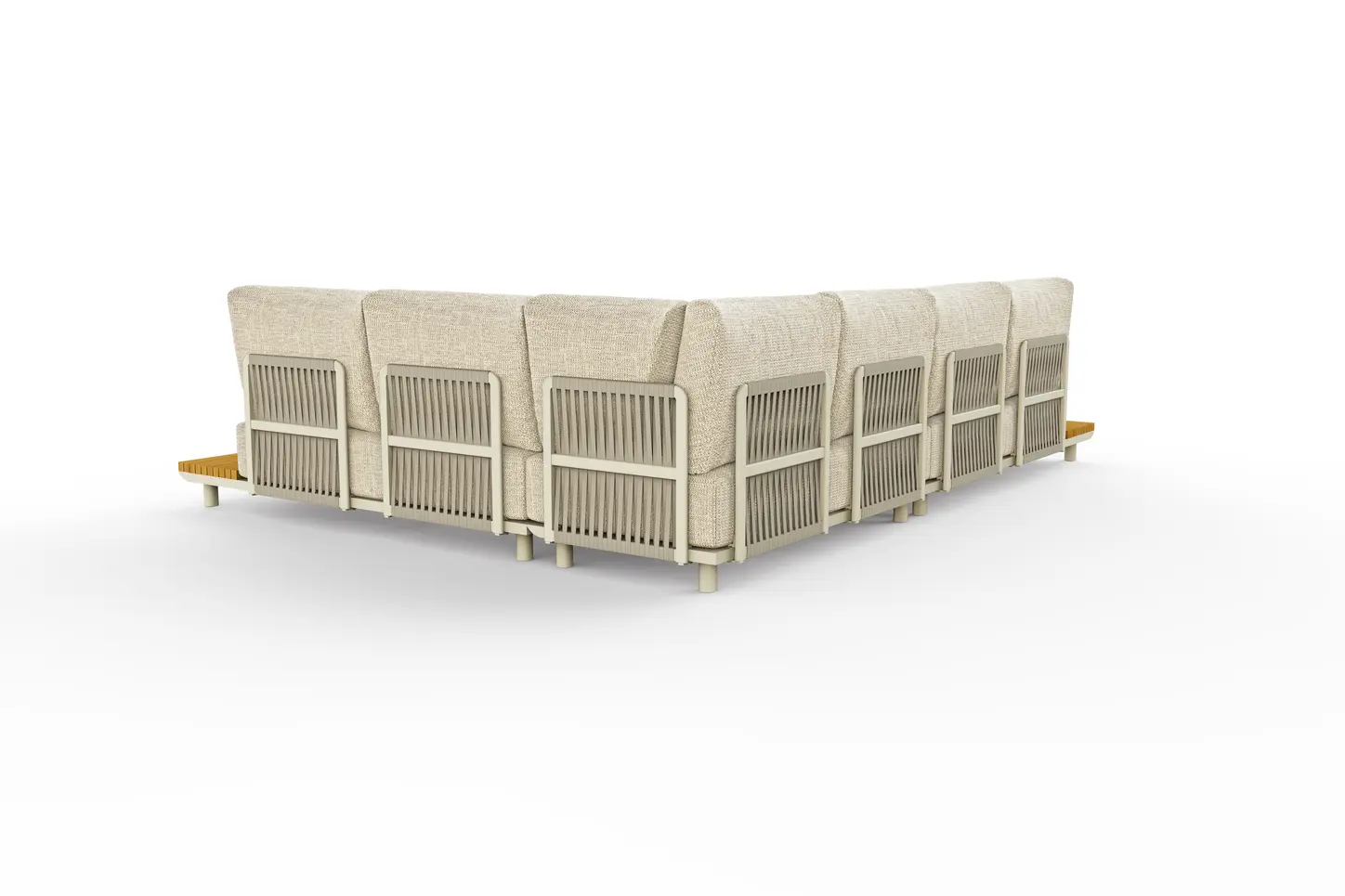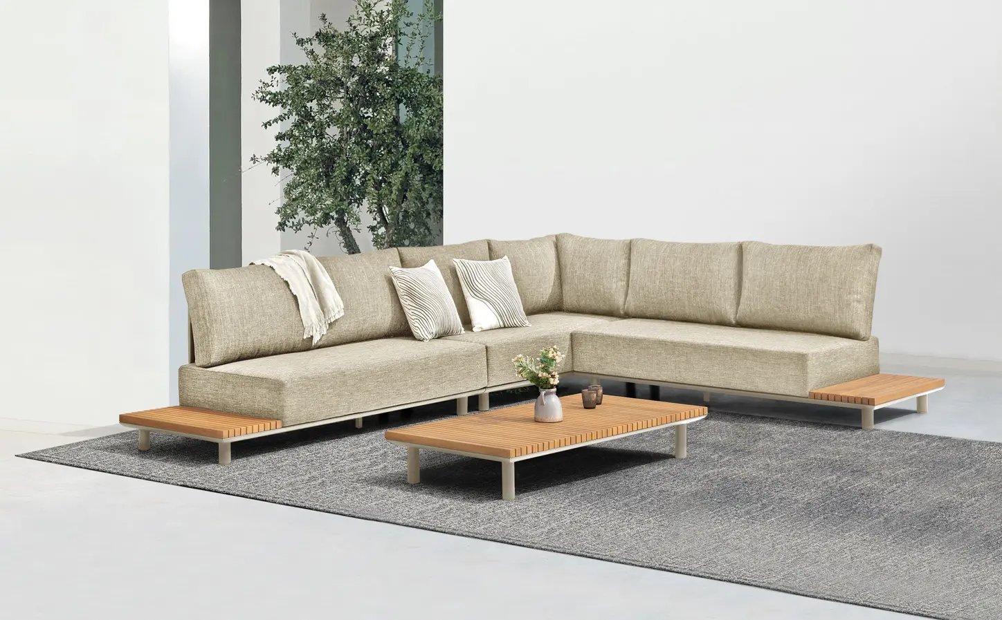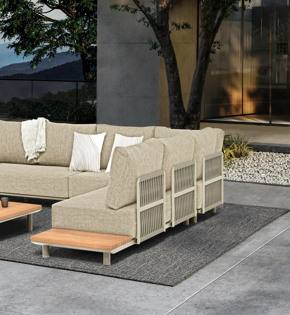 Набор имеет гладкую алюминиевую раму, а столешницы сделаны из тика. Роскошные подушки толщиной 22см, чехлы изготовлены из высококачественной, водоотталкивающей и устойчивой к погодным условиям ткани Sunproof®olefin