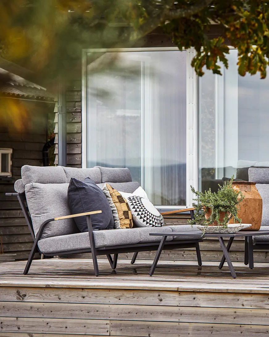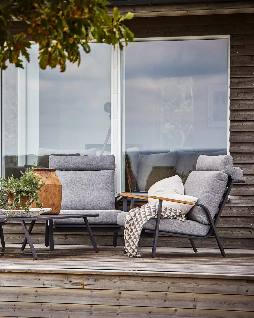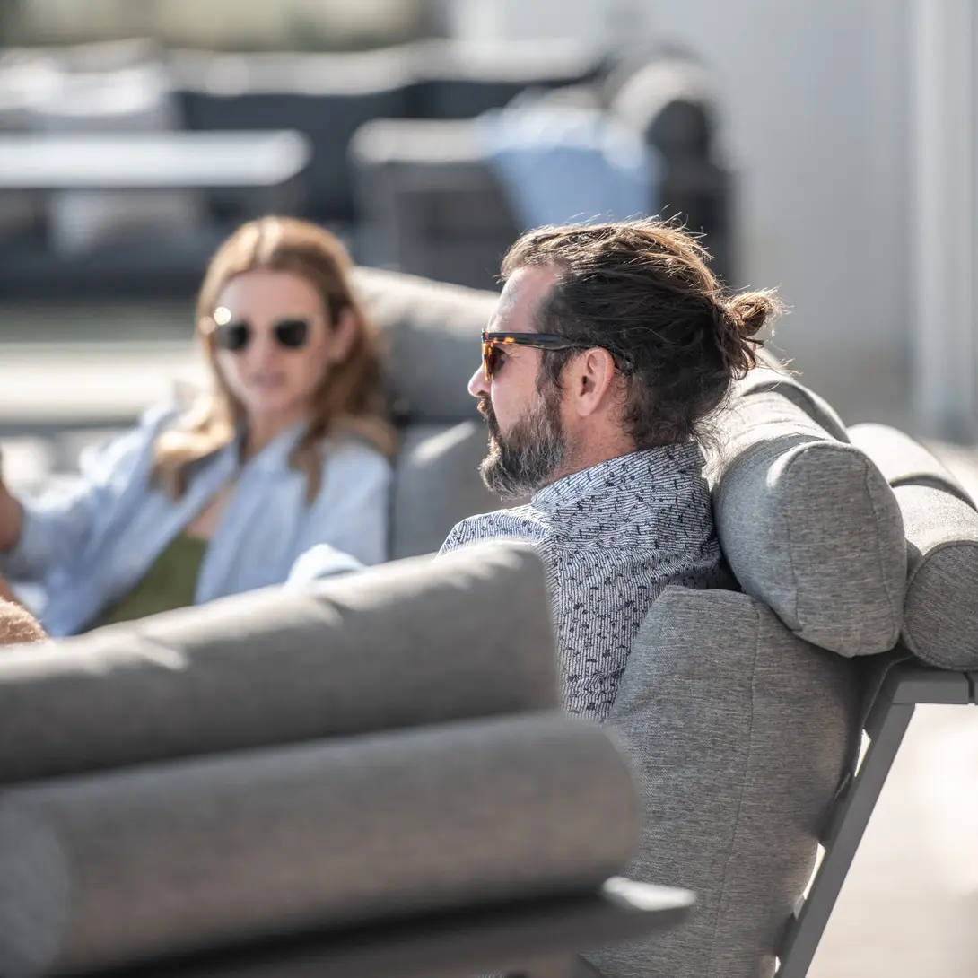 Прямые линии, неподвластный времени дизайн в современном стиле. Низкие сиденья создают дополнительное ощущение современного салона. Захватывающее сочетание разных материалов: алюминий и детали из тика в подлокотниках. Очень удобные подушки из пенопласта с высокой эластичностью и покрытые олефиновой тканью с подкладкой, которая делает их водоотталкивающими. Максимальный комфорт с подушкой для шеи. Группа с красивыми деталями и углами.