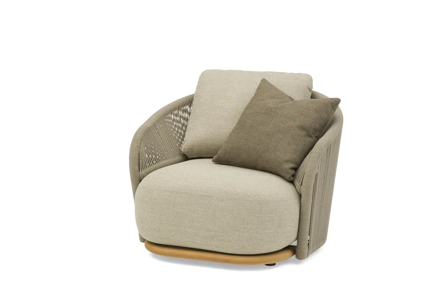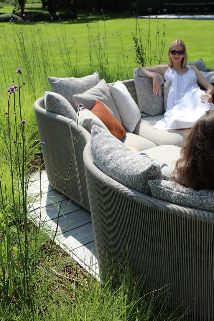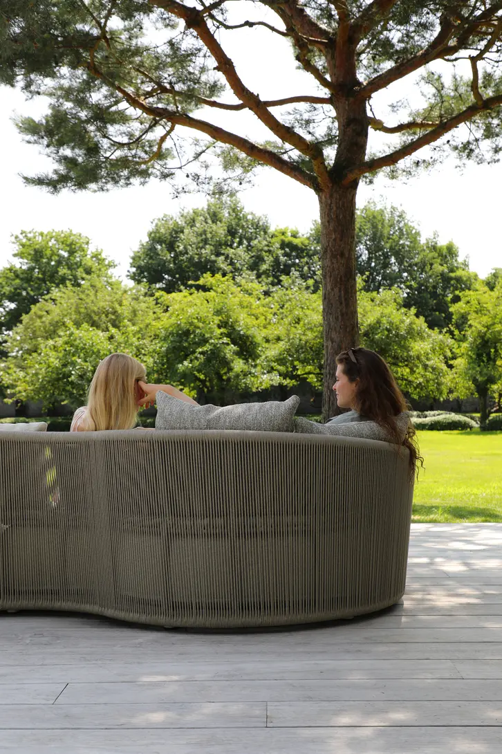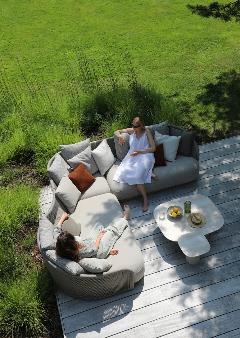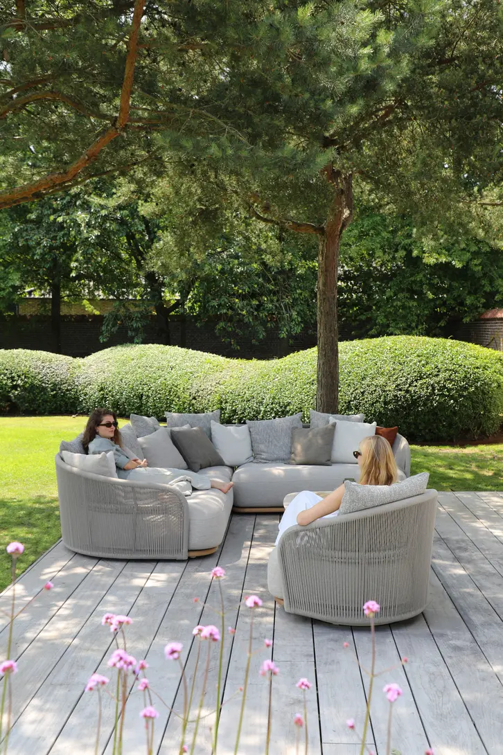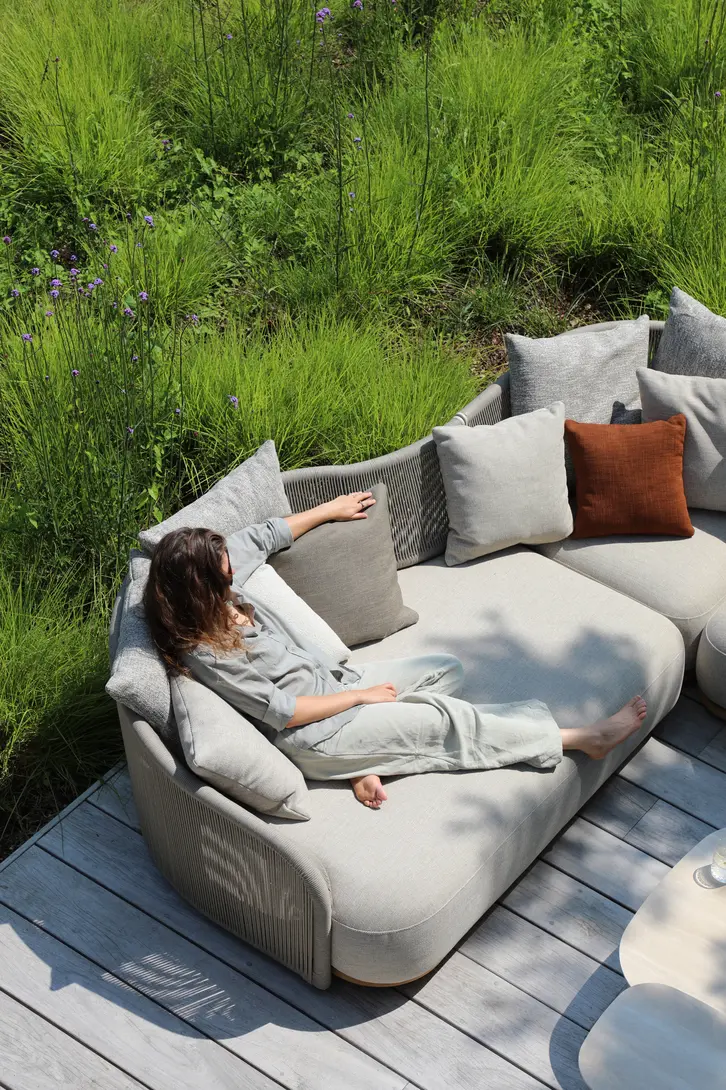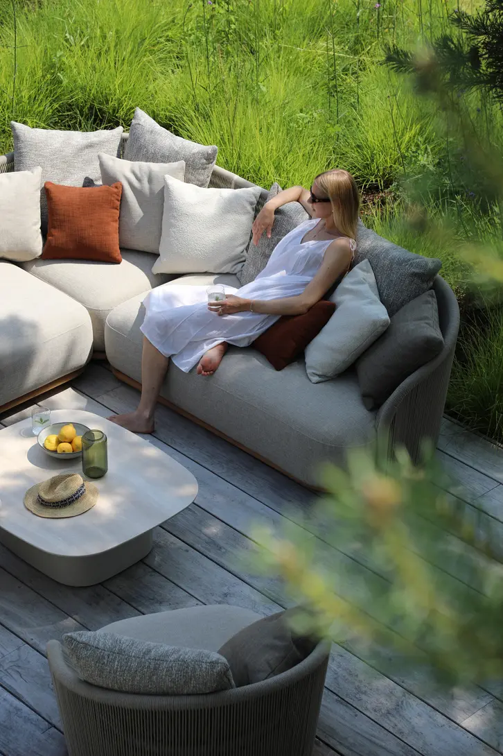 Каркас: алюминий + тиковое дерево FSC + олефиновая веревка. Подушки с наполнителем из пенополиуретана, солнцезащитная ткань.