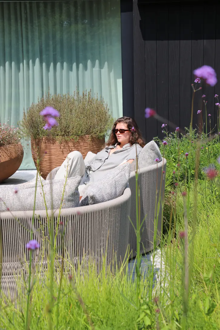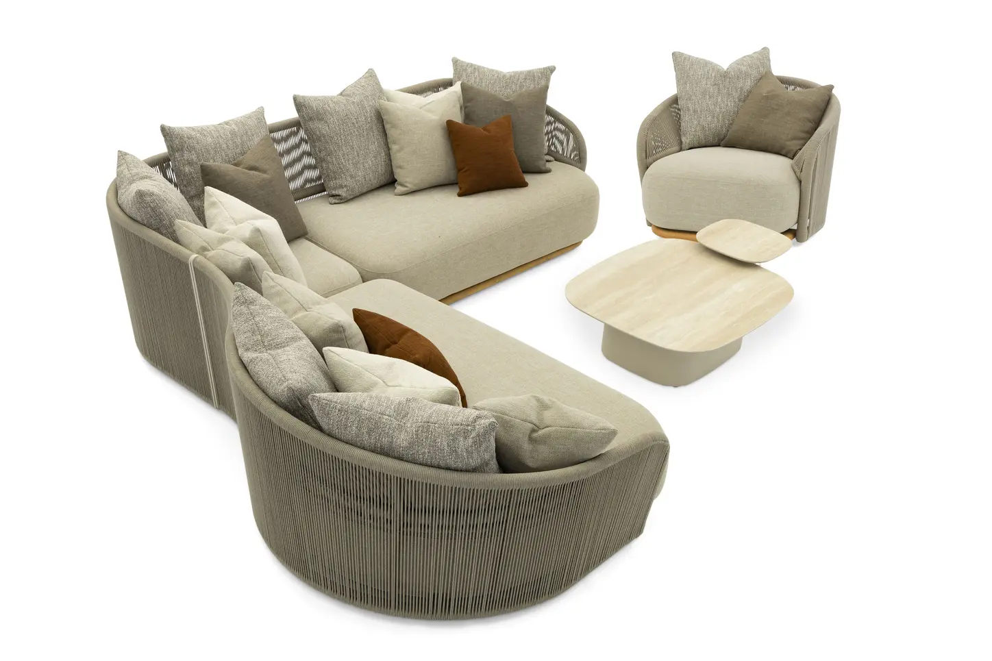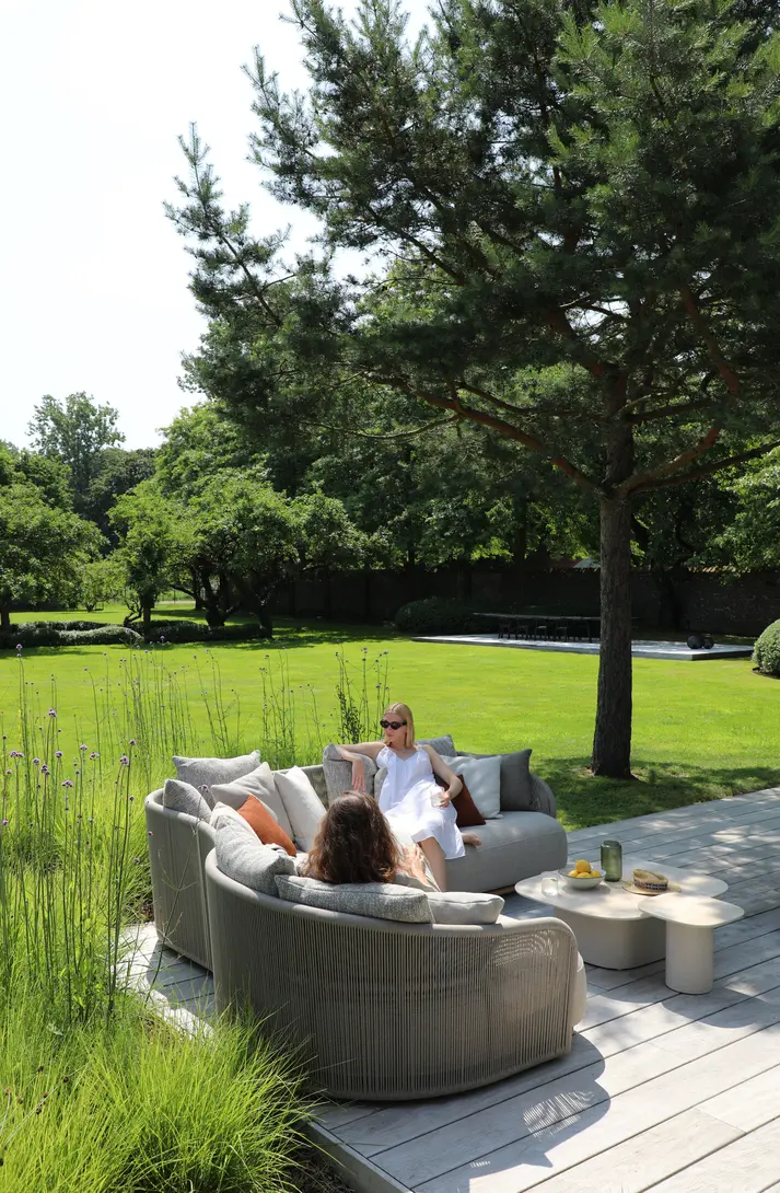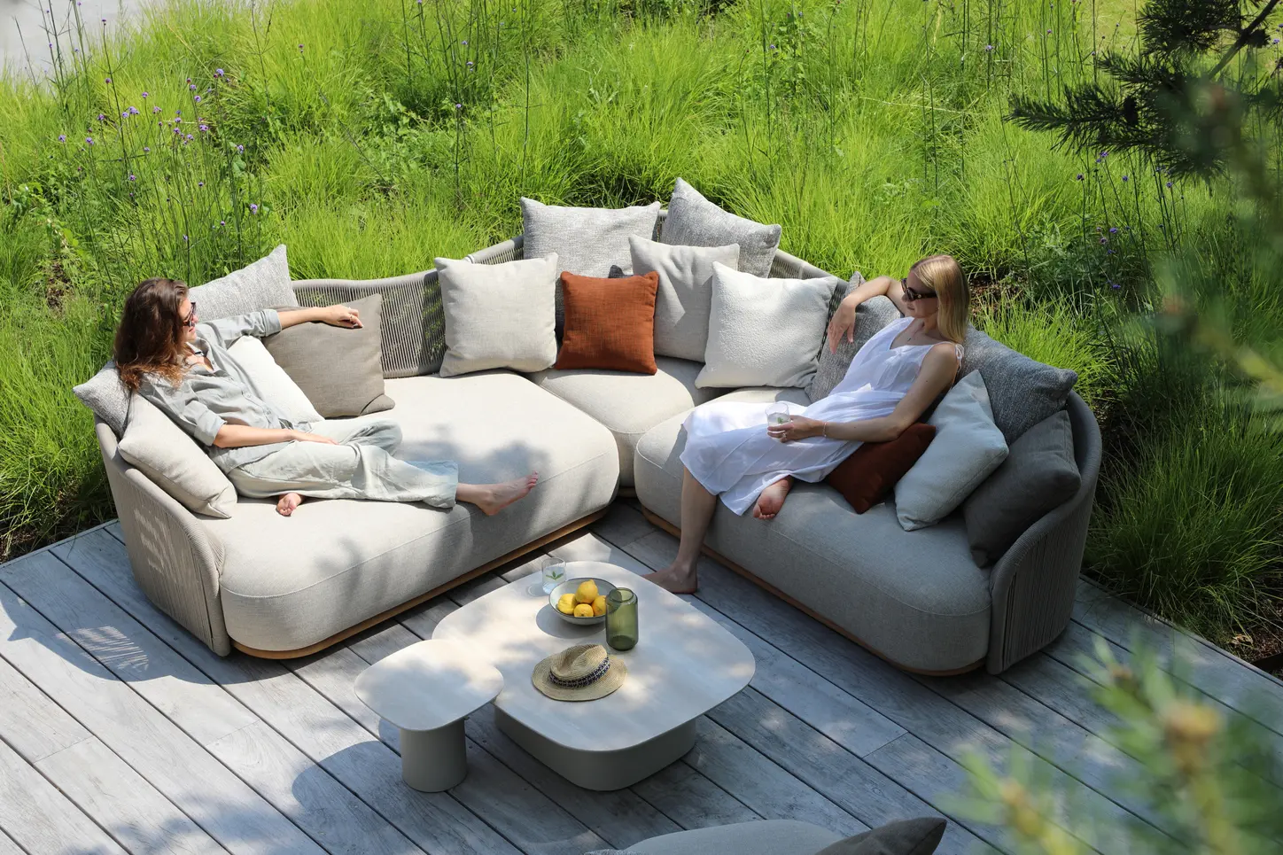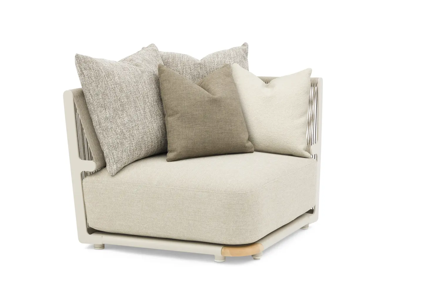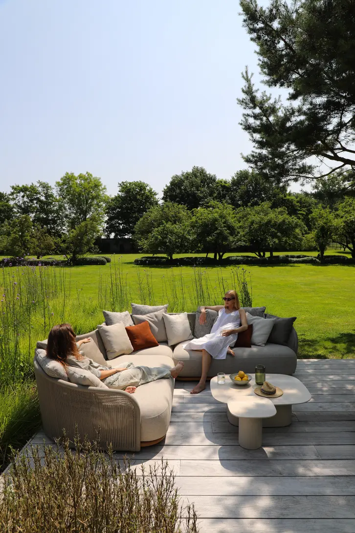 Каркас: алюминий + тиковое дерево FSC + олефиновая веревка. Подушки с наполнителем из пенополиуретана, солнцезащитная ткань.