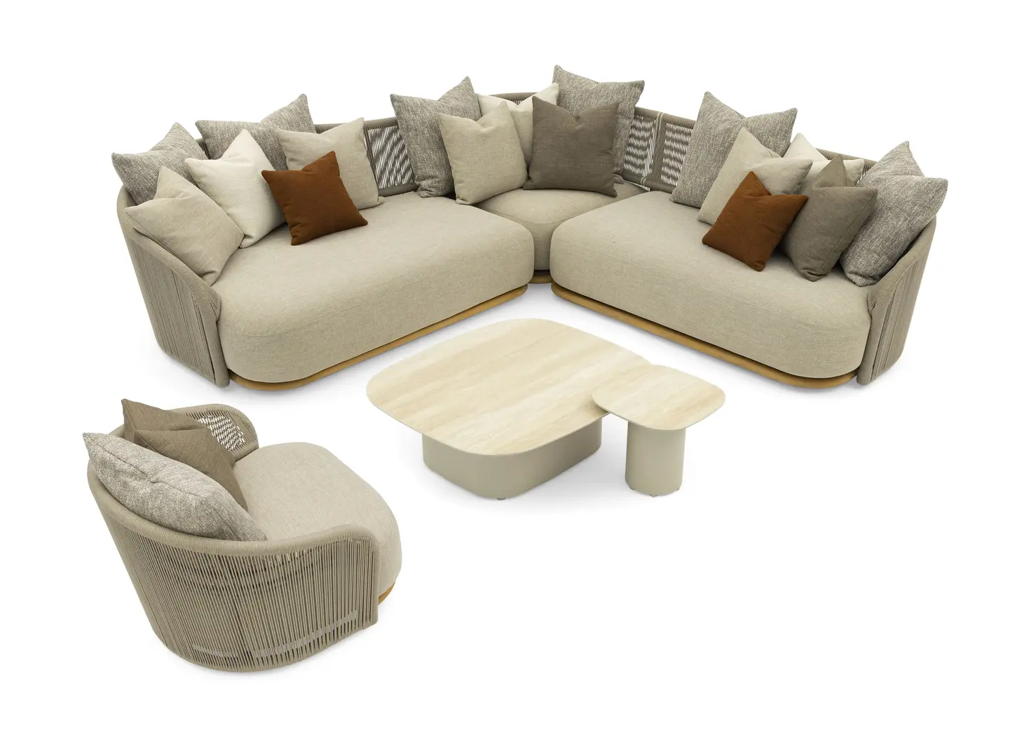 Комплект состоит из углового дивана (c глубокой правой частью), вращающегося кресла и парных керамических столиков.
