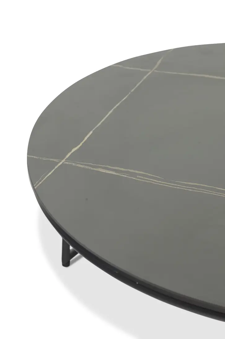 Комплект парных столиков из алюминия антрацитового цвета с черной столешницей.