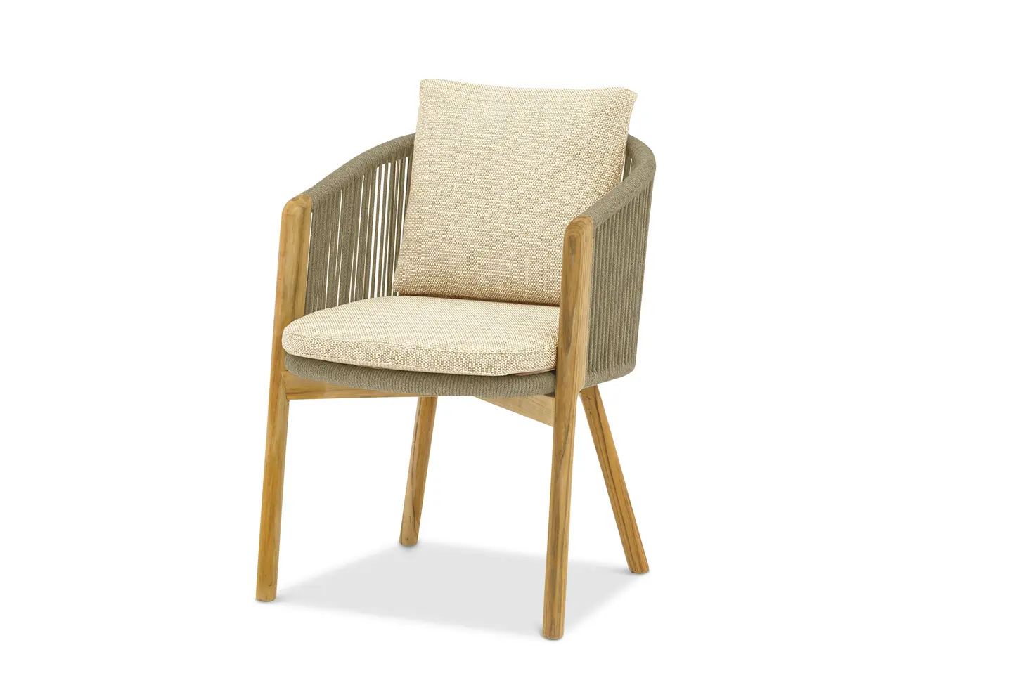 Обеденные столы имеют керамическую столешницу толщиной 6мм с краями из цельного тика, вес стола- 67,5кг. Алюминиевый каркас спинки сиденья кресла, ножки из тикового дерева FSC + олефиновая веревка, подушка с наполнителем из пенополиуретана, солнцезащитная ткань.