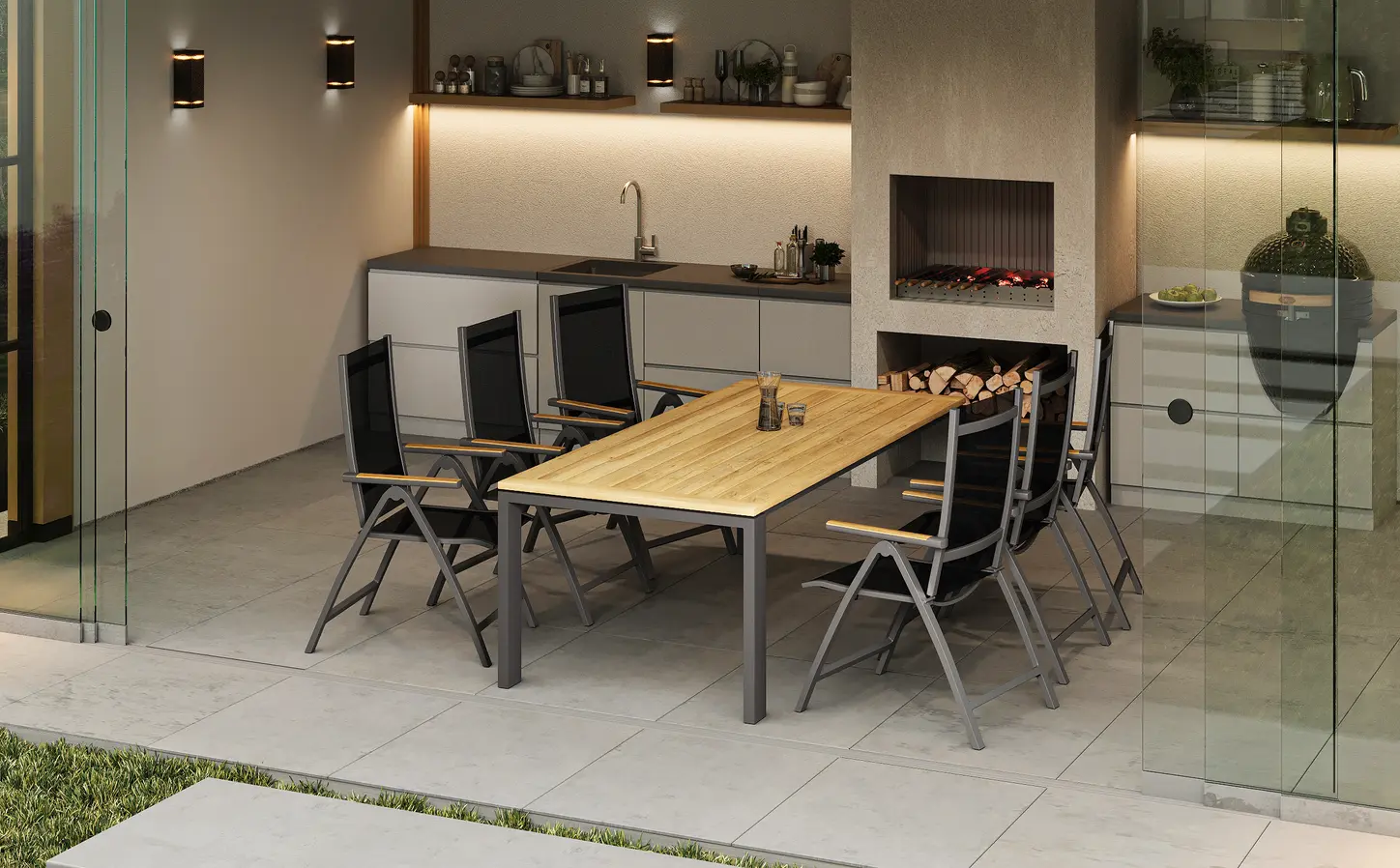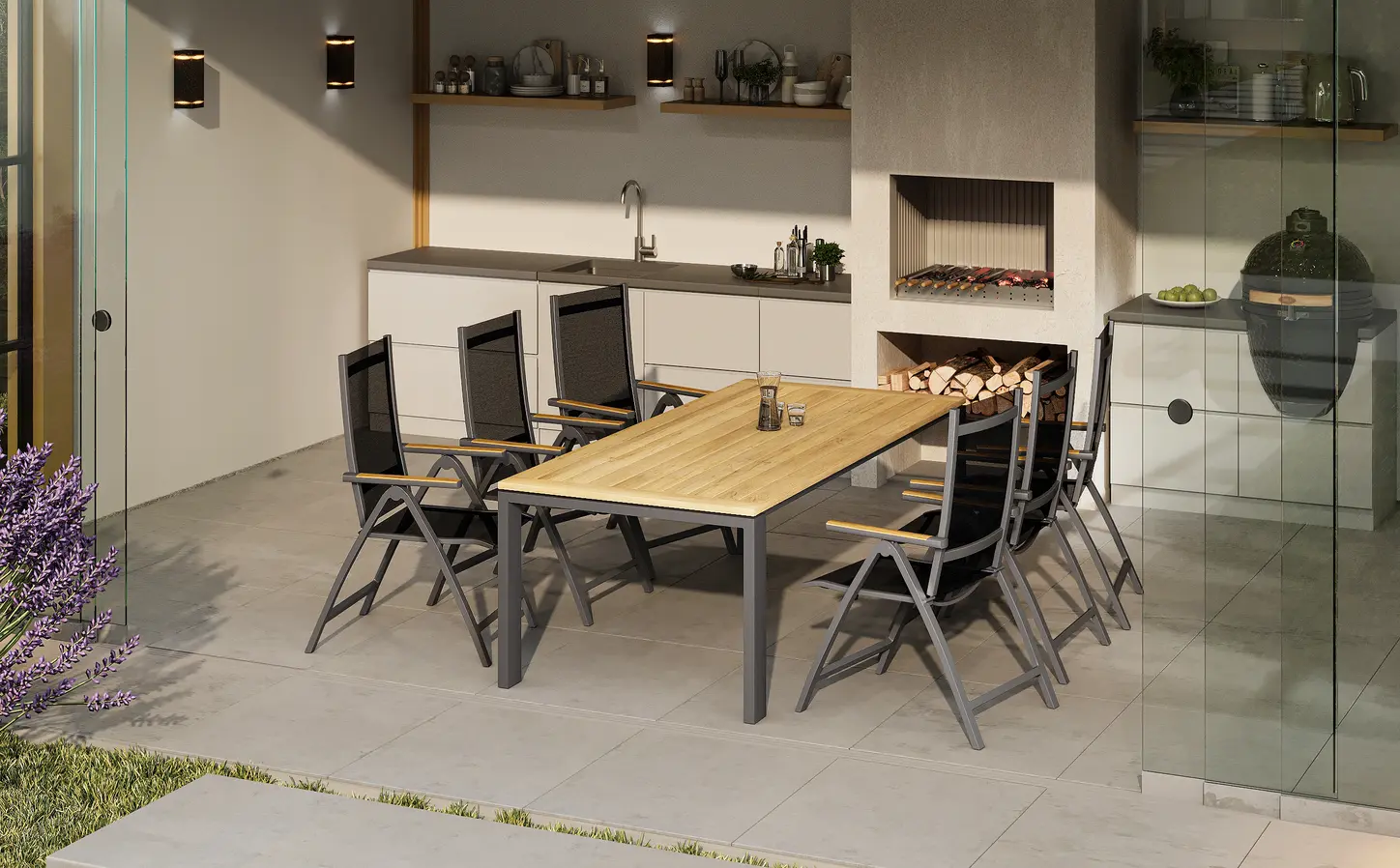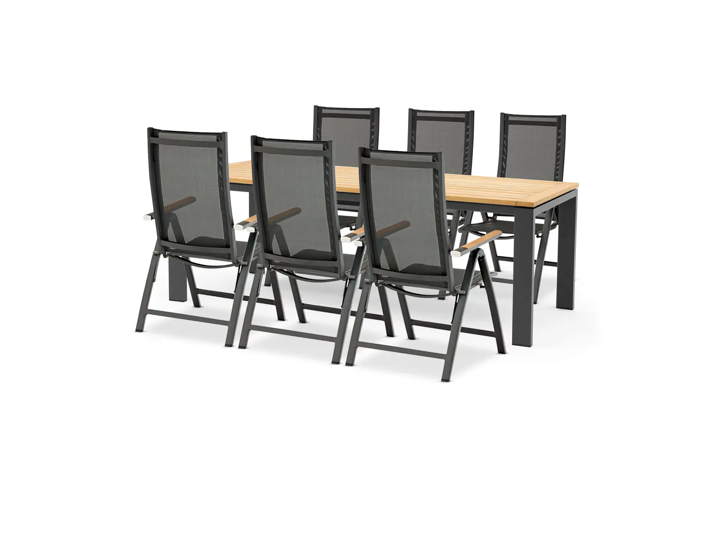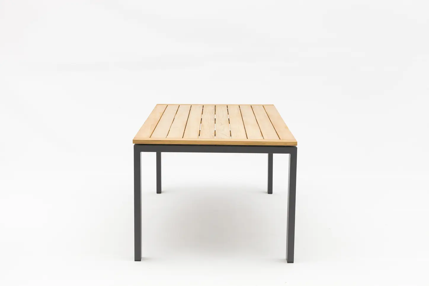 Lyon - это роскошные столы со столешницей из тикового дерева. Вся конструкция прочная и элегантная.