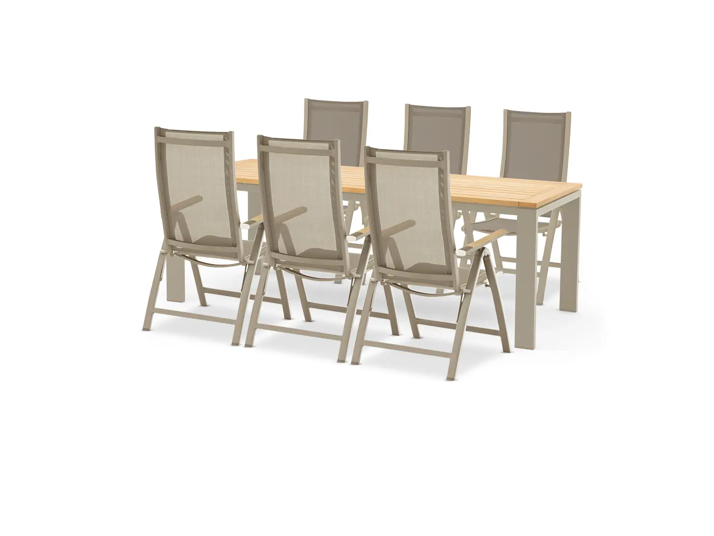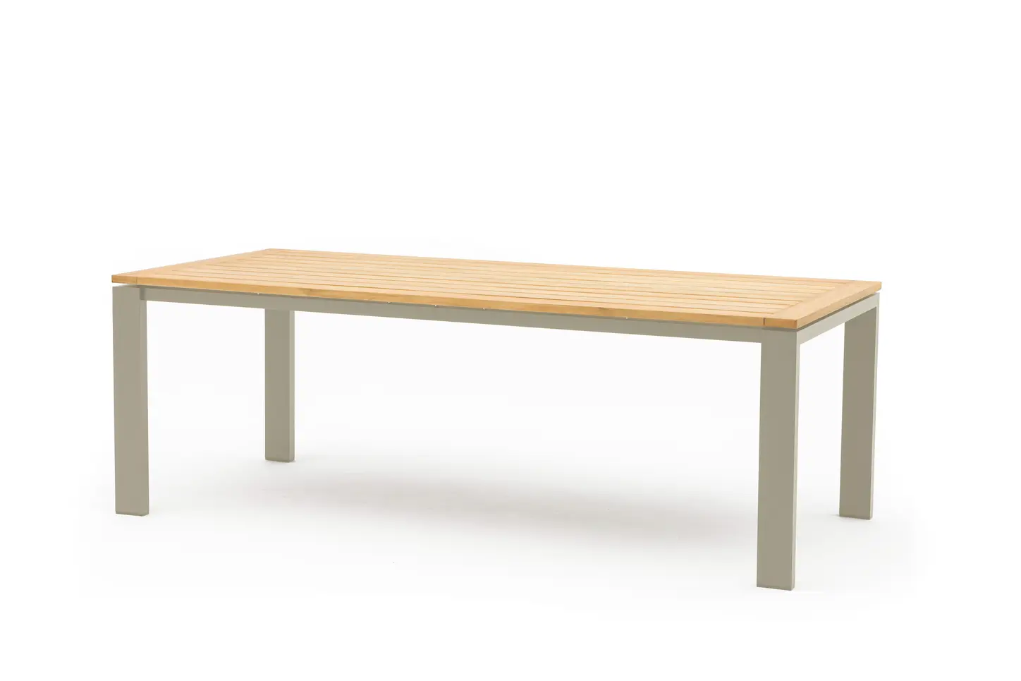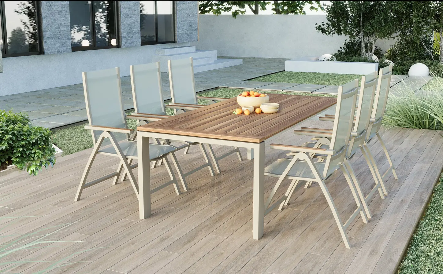 Lyon - это роскошные столы со столешницей из тикового дерева. Вся конструкция прочная и элегантная.