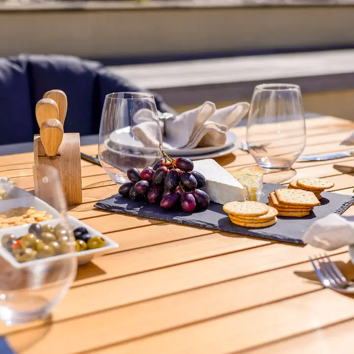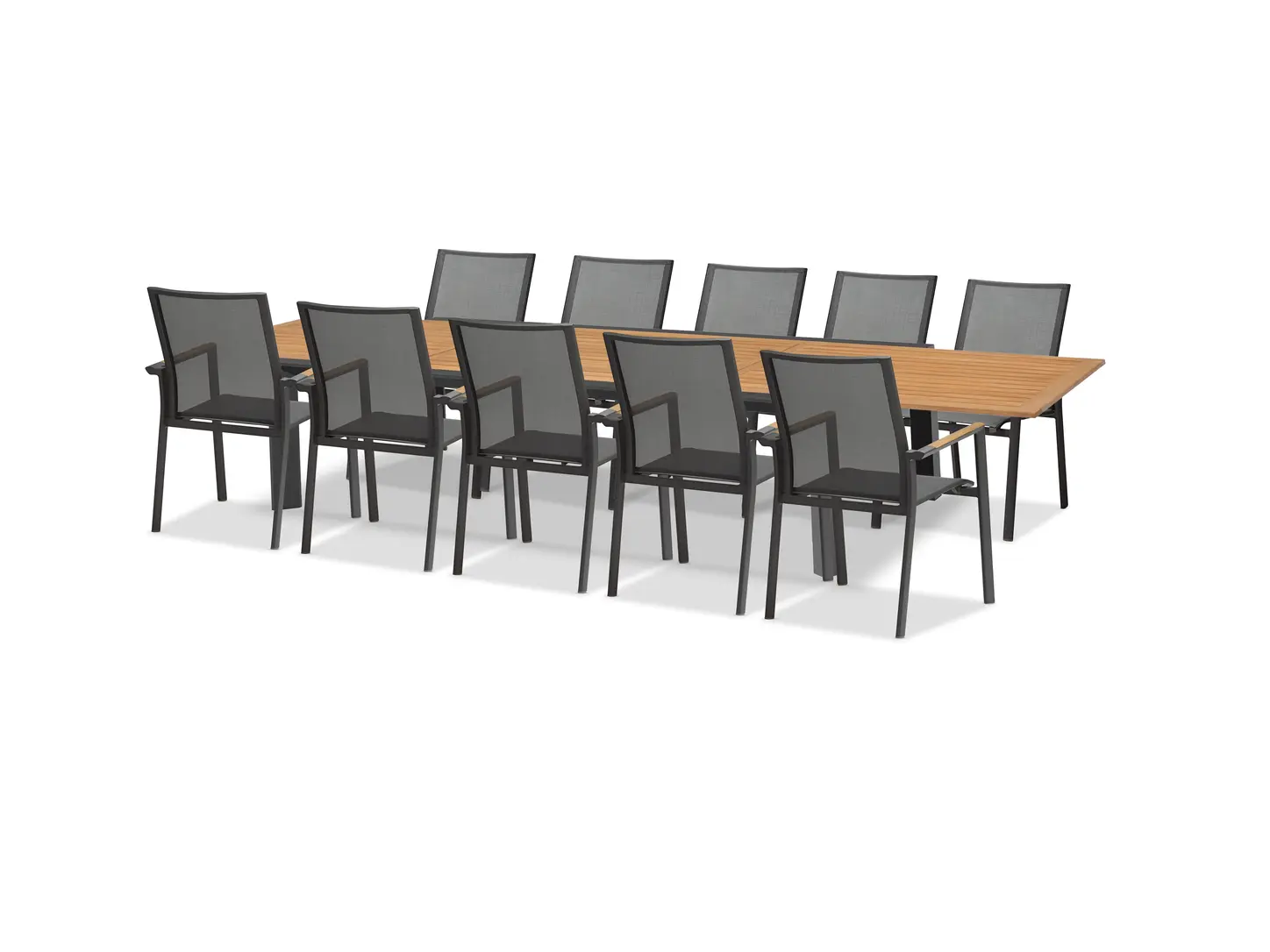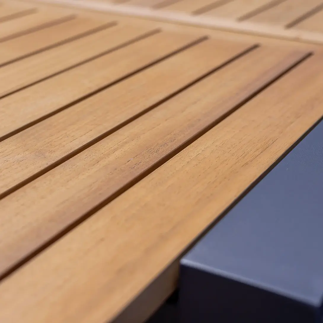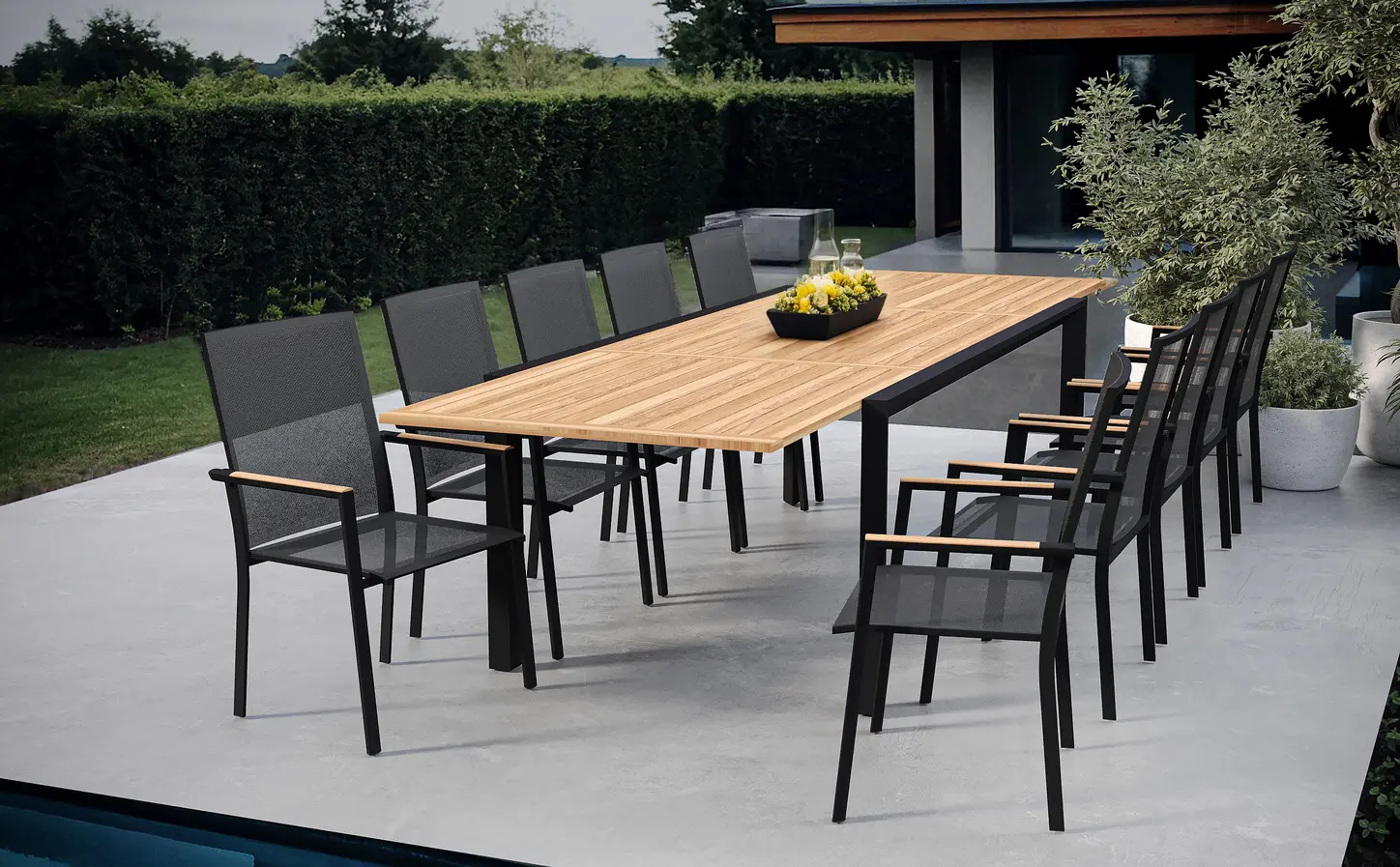 Nora- наш самый большой раздвижной стол + 10 штабелируемых кресел . Подстолье выполнено из алюминия, а верх из тикового дерева. Вся конструкция прочная и элегантная. Классические цвета означают, что они сочетаются со многими нашими стульями, независимо от того, какую комбинацию вы предпочитаете.