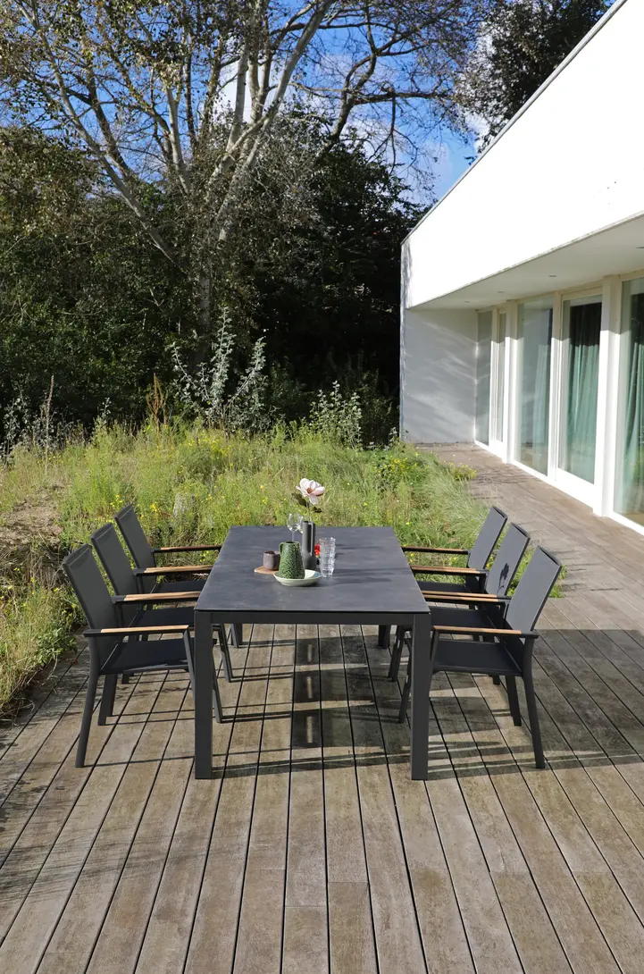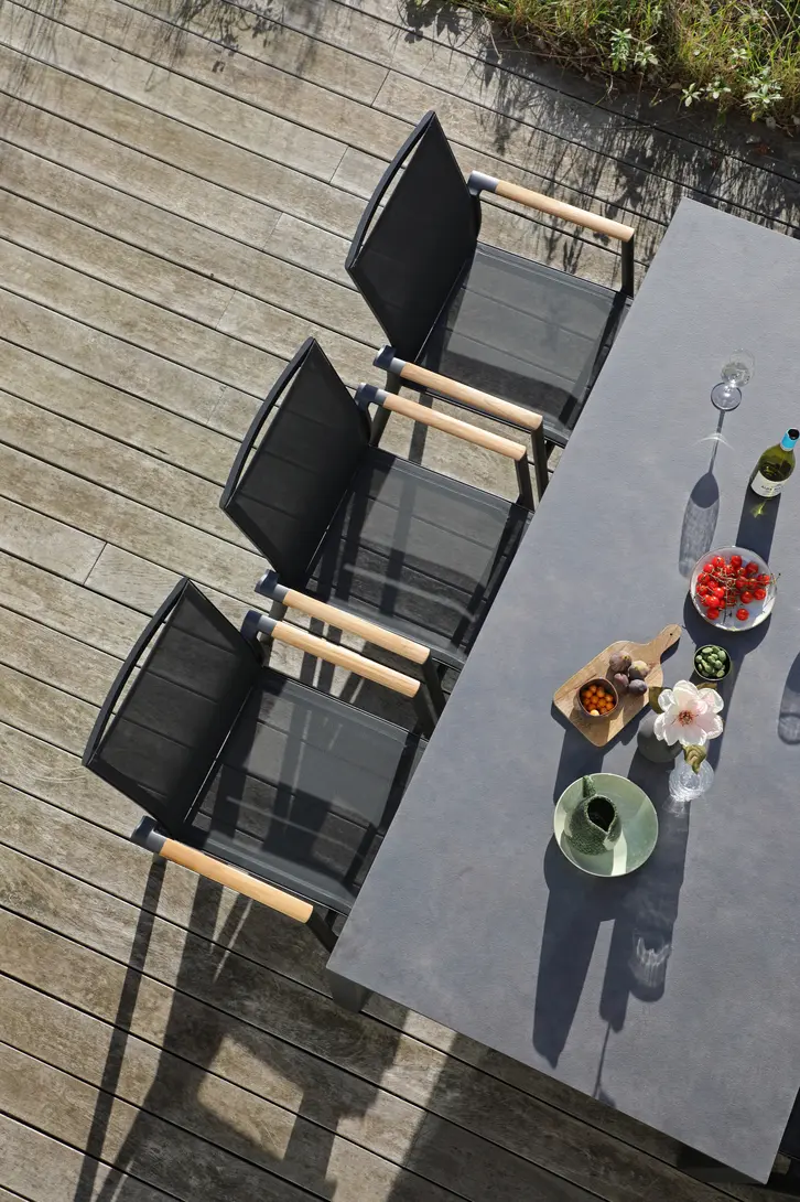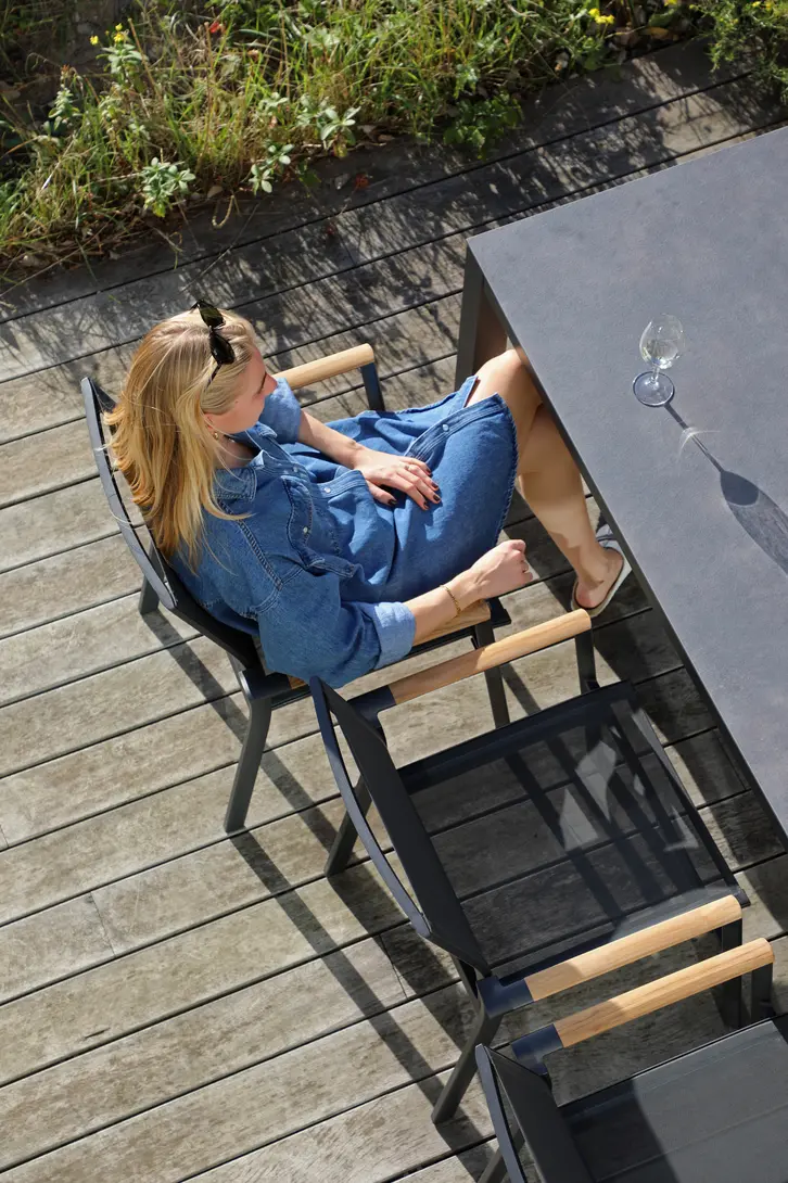 Современная коллекция, состоящая из штабелируемых стульев и лежаков. Каждая деталь имеет современную эстетику, стильные детали на ножках и рамах, а также превосходный комфорт для сидения. Тиковые подлокотники.