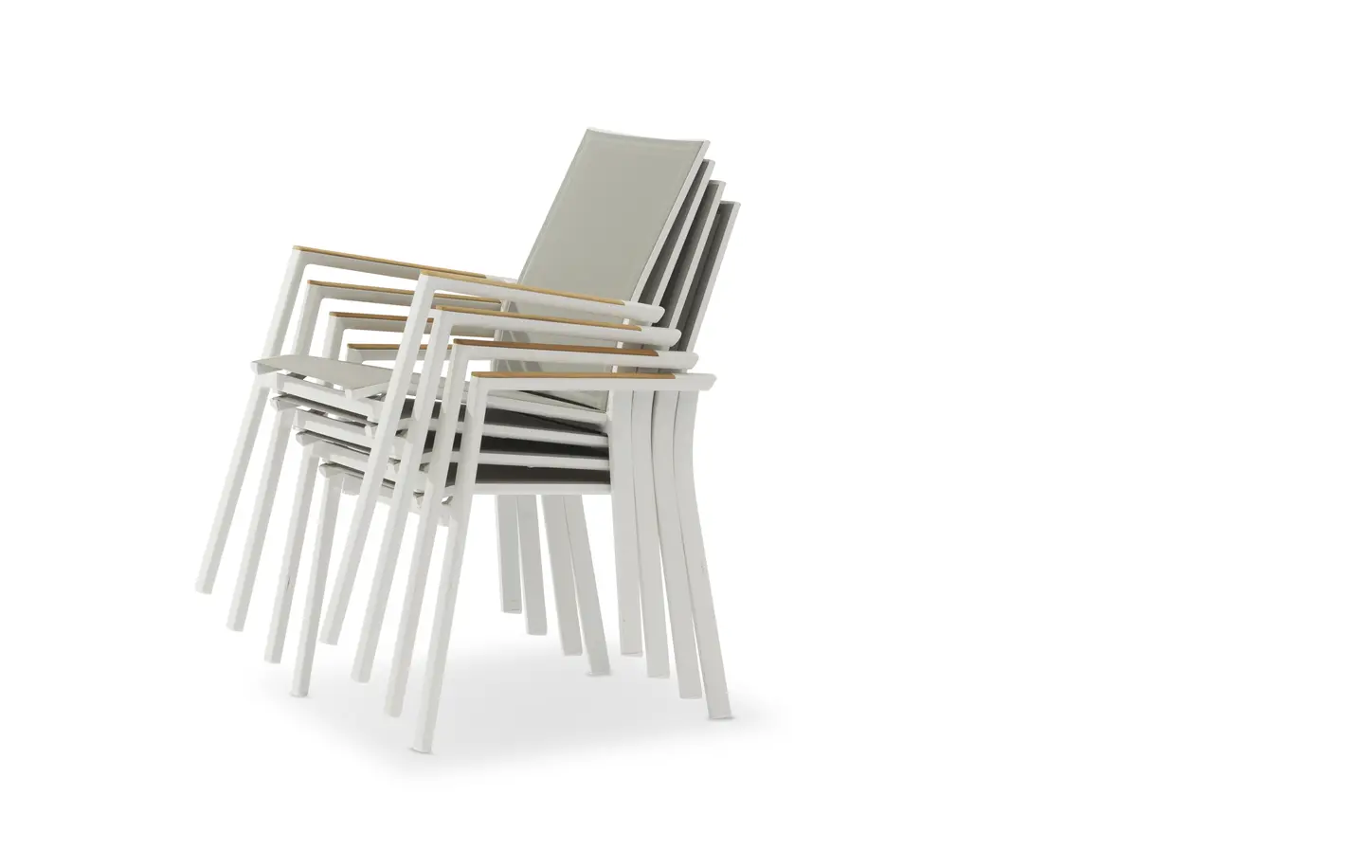 Современная коллекция, состоящая из штабелируемых стульев и лежаков. Каждая деталь имеет современную эстетику, стильные детали на ножках и рамах, а также превосходный комфорт для сидения. Тиковые подлокотники.