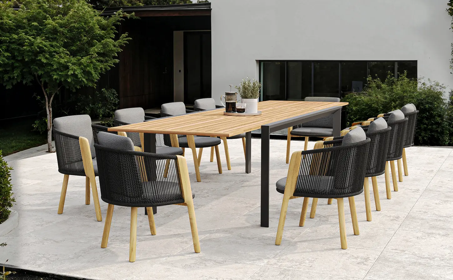 Алюминиевый каркас спинки сиденья кресла, ножки из тикового дерева FSC + олефиновая веревка, подушка с наполнителем из пенополиуретана, солнцезащитная ткань.