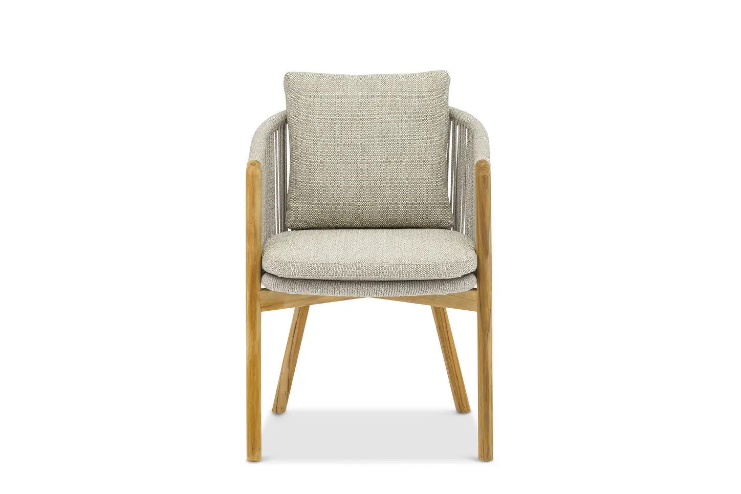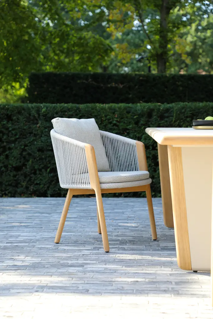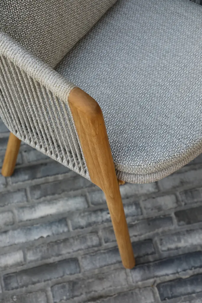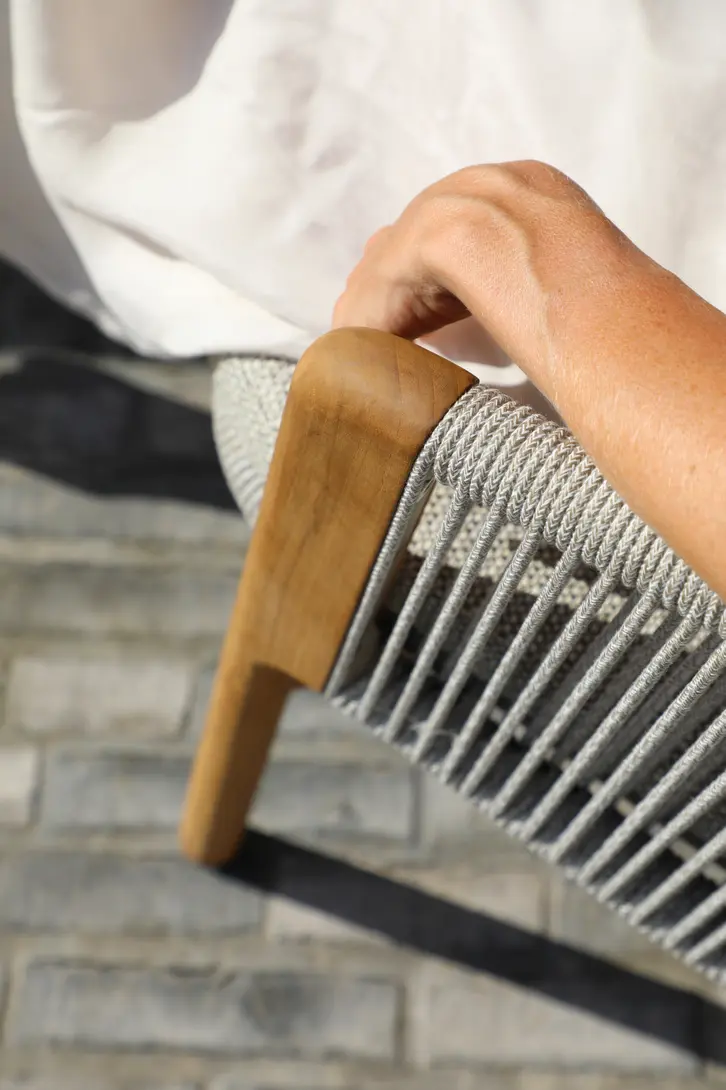 Алюминиевый каркас спинки сиденья кресла, ножки из тикового дерева FSC + олефиновая веревка, подушка с наполнителем из пенополиуретана, солнцезащитная ткань.