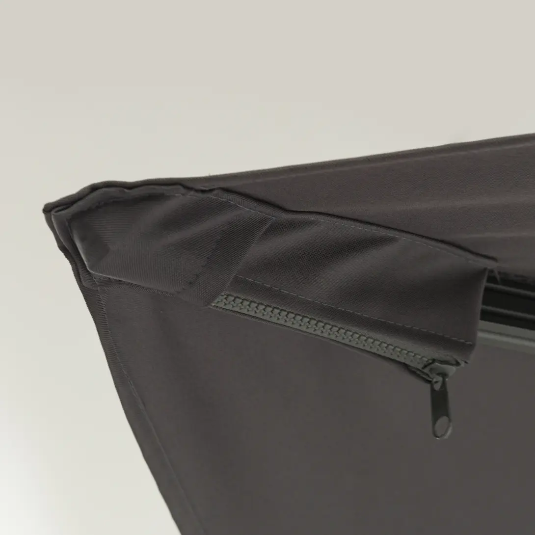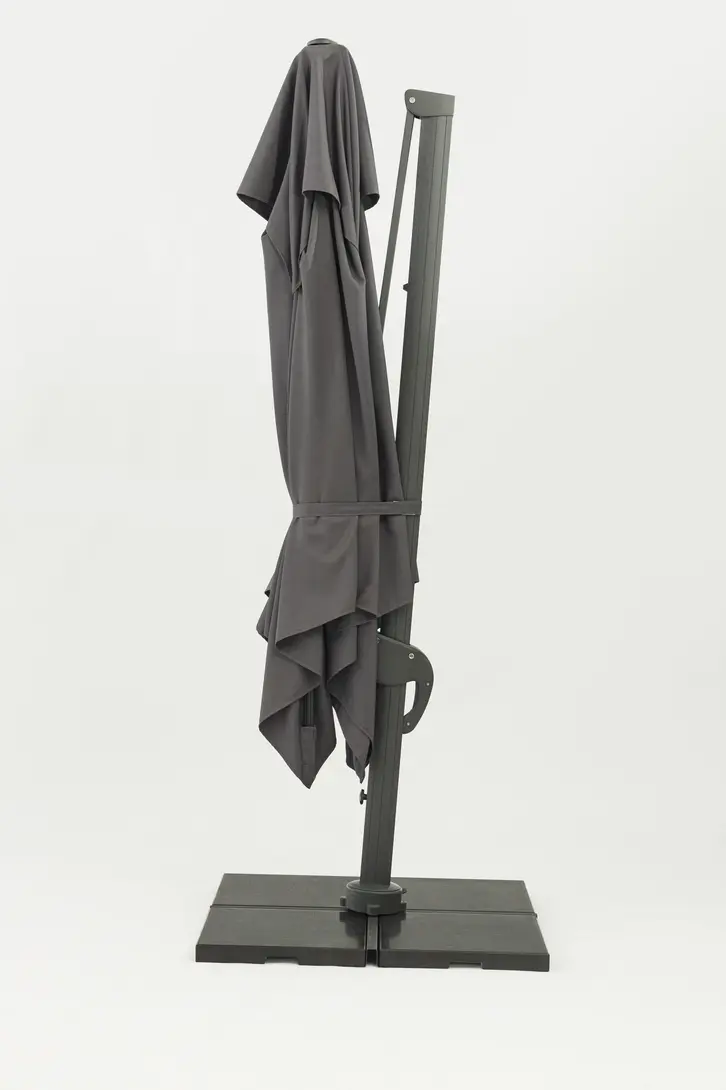 Подвесной зонтик из алюминия на боковой опоре с функцией поворота на 360° вокруг своей оси, материал купола- полиэстер, плотность тента-230 г/м², с отличной светостойкостью. В комплект входят утяжелители черного цвета 4 шт по 30 кг каждый и чехол.