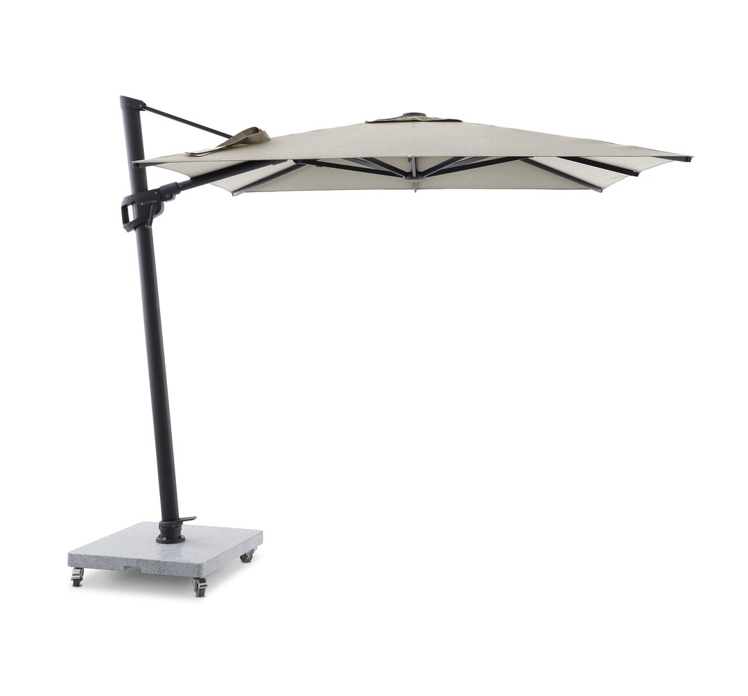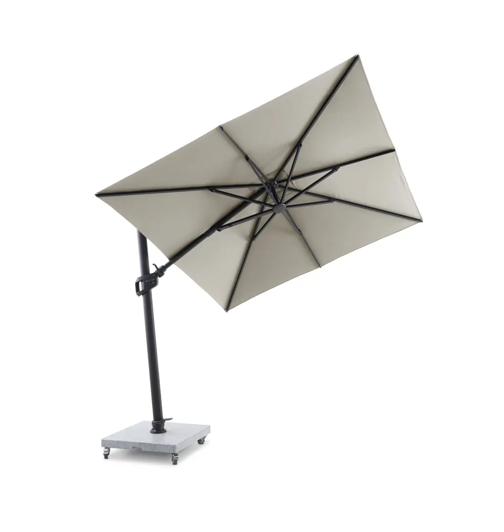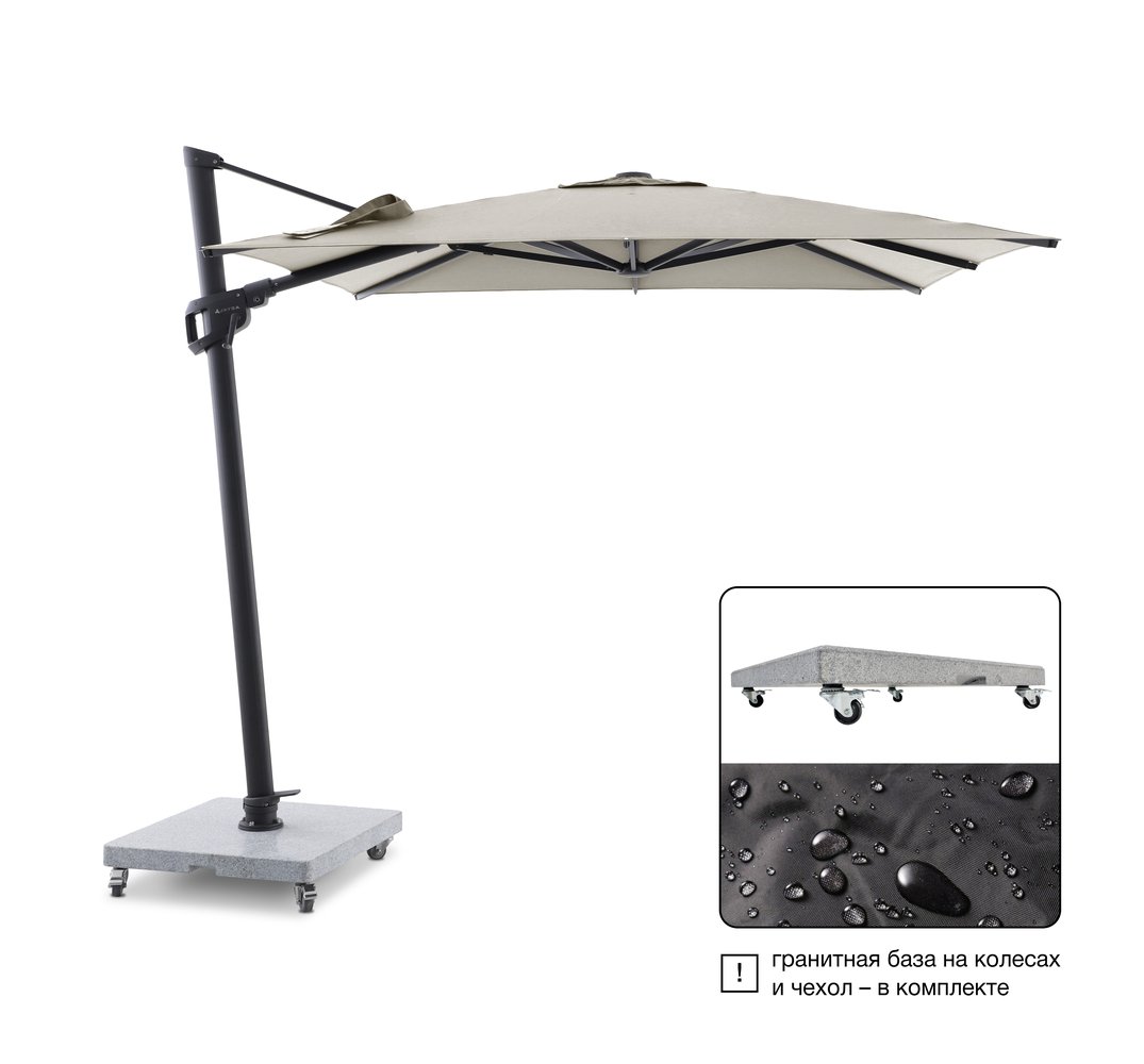 Основание зонта: гранит, вес- 130 кг, квадратная форма, размер: 80x80x6 см светло-серая полировальная поверхность, с колесами.