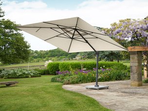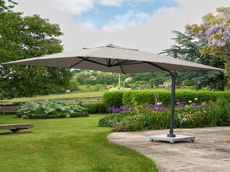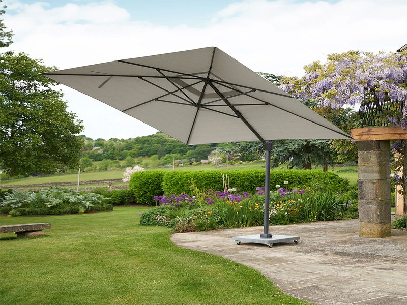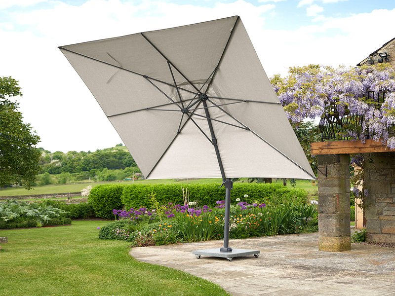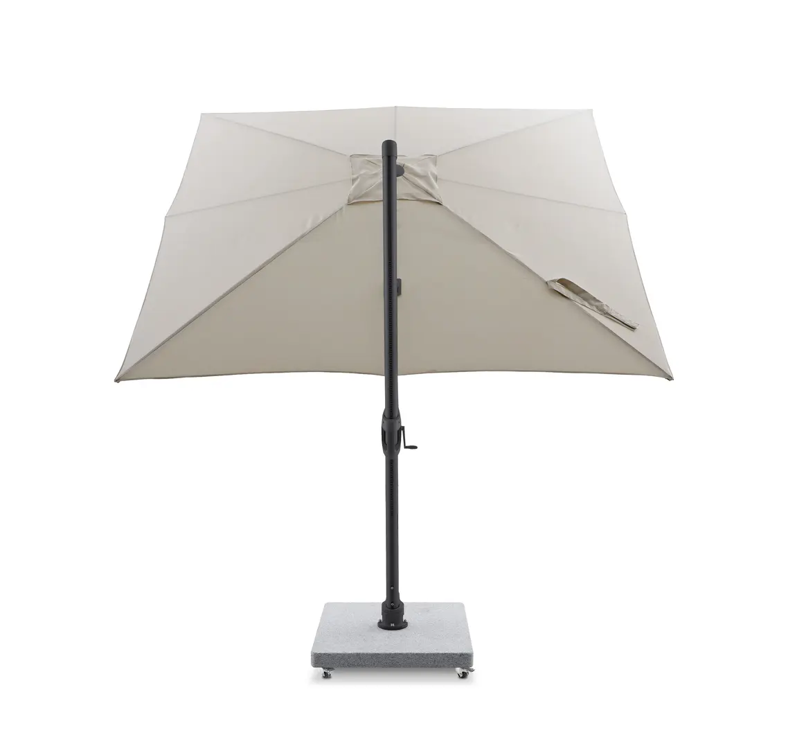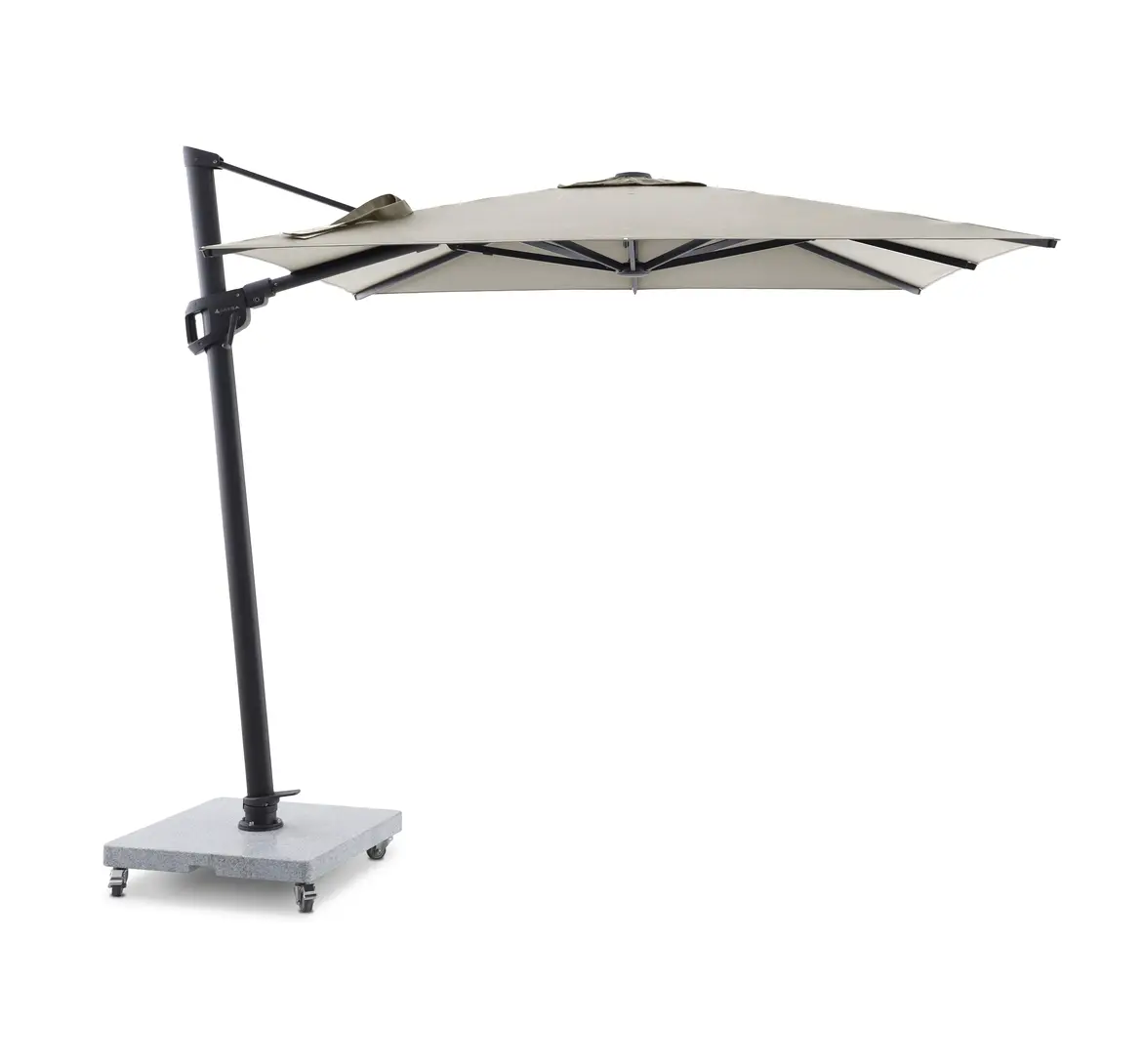 Основание зонта: гранит, вес- 130 кг, квадратная форма, размер: 80x80x6 см светло-серая полировальная поверхность, с колесами.